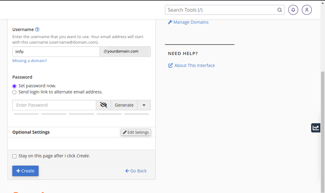 Now enter your username that you want to create and generate your password. In my case, 'info' is my username. Keep the password in safe file, it will help to login the webmail.