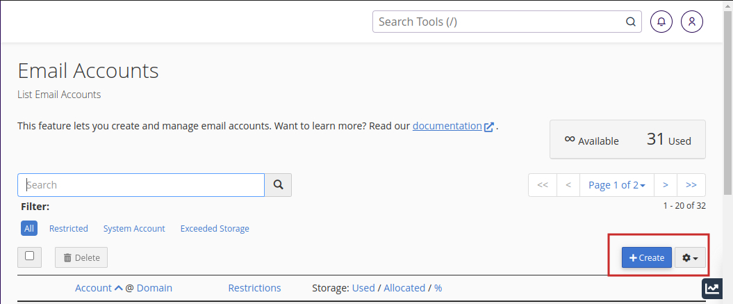 To create a new email account, hit the create button. You can create number of account here.